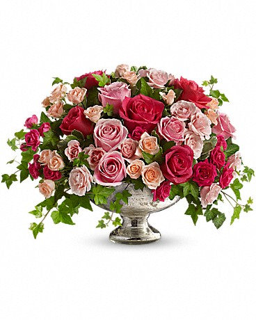 When you really want to make a grand impression on someone special, choose this regal arrangement. Roses, in every possible shade of pink, are so beautifully arranged in an exclusive silver Mercury Glass Bowl, there's no doubt you'll be treated like royalty when you send it! Sunrise Flower Shop